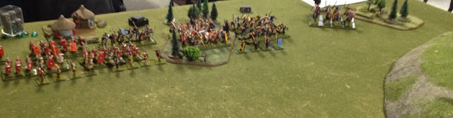 I made a critical mistake in my set up, for some reason I thought my German infantry was FL, whereas after putting them in difficult ground I looked down at my list and realized they were actually FP, this resulted in the two units to attack piecemeal. I also risked my German cavalry in a straight forward charge at his auxillaries, gambling that they could be softened up before my strong German infantry could charge home. This is because there is a special rule where Roman auxillaries cancel the impetuous bonus of warbands. I'm not sure how I feel about the historical accuracy of that rule, but it does make auxillaries very useful and gives the Romans an important chance against those strong large units of warbands. Anyway, my gamble didn't pay off and my German flank was wiped out.